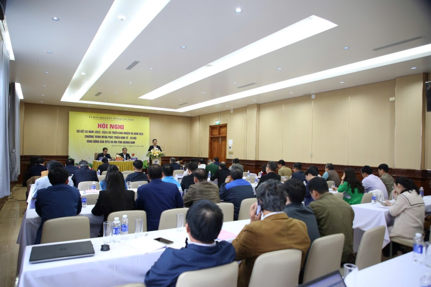 Toàn cảnh Hội nghị sơ kếtGiai đoạn 2022 - 2024, tỉnh Quảng Nam được phân bổ vốn hơn 2.384 tỷ đồng triển khai thực hiện chương trình mục tiêu quốc gia phát triển kinh tế - xã hội vùng đồng bào DTTS và miền núi. Trong đó, vốn Trung ương hơn 1.991 tỷ đồng; vốn địa phương hơn 277 tỷ đồng và vốn vay hơn 115 tỷ đồng. Đến nay, 100% vốn được phân bổ để triển khai thực hiện 10 dự án của chương trình. Tính đến 30/11/2024, đã giải ngân gần 1.427 tỷ đồng, đạt 60% theo kế hoạch.