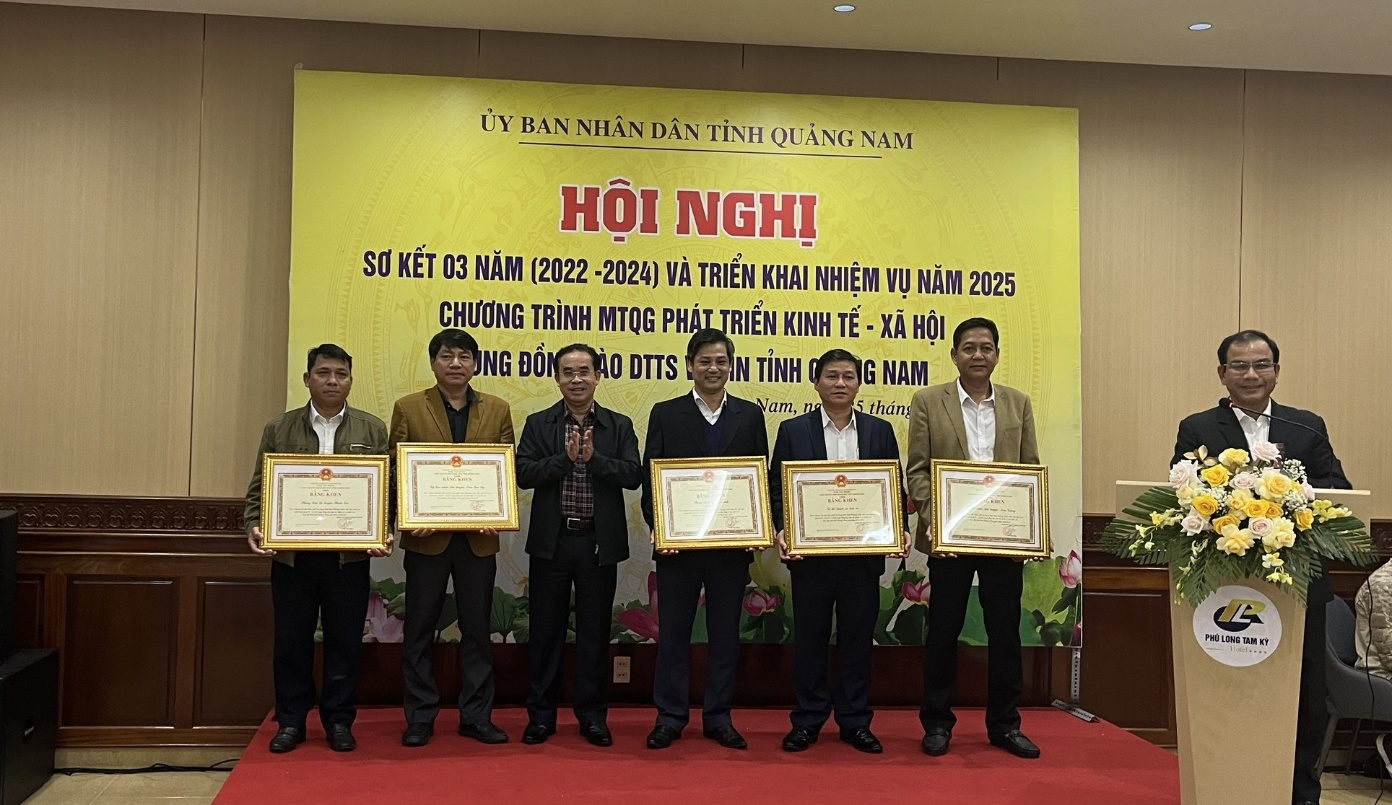 Tại Hội nghị, Phó Chủ tịch UBND tỉnh Trần Anh Tuấn cũng đã trao tặng Bằng khen của Chủ tịch UBND tỉnh cho 05 tập thể và 08 cá nhân đã có thành tích tiêu biểu, xuất sắc trong thực hiện Chương trình Mục tiêu Quốc gia phát triển kinh tế - xã hội vùng đồng bào dân tộc thiểu số và miền núi trên địa bàn tỉnh Quảng Nam, giai đoạn 2022-2024.