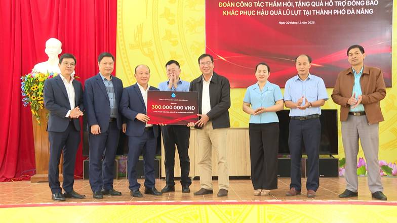 Đồng chí Mai Quang Vĩnh, Phó Giám đốc Sở tiếp nhận cùng đại diện chính quyền xã tiếp nhận bản tượng trưng trị giá 300 triệu đồng từ Công ty Cổ phần đầu tư nước sạch Sông Đà để hỗ trợ khắc phục hậu quả bão lũ tại thành phố Đà Nẵng (Ảnh: Viết Trọng)