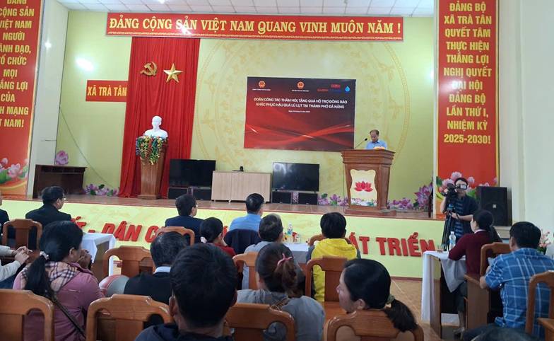 Đại diện lãnh đạo Sở Dân tộc và Tôn giáo, đồng chí Mai Quang Vĩnh phát biểu ghi nhận tinh thần trách nhiệm, sự nỗ lực, cố gắng của chính quyền xã Trà Tân trong công tác theo dõi tình hình thiên tai, thống kê thiệt hại và tập trung khắc phục hậu quả và nhanh chóng hỗ trợ, giúp đỡ đồng bào dân tộc thiểu số chịu thiệt hại sớm vượt qua khó khăn, ổn định đời sống, sản xuất. Đại diện lãnh đạo Sở trân trọng sự quan tâm chia sẻ, hỗ trợ của Bộ Dân tộc và Tôn giáo và cộng đồng doanh nghiệp đối với Nhân dân vùng đồng bào dân tộc thiểu số và miền núi thành phố Đà Nẵng chịu thiệt hại do bão lũ, sạt lỡ đất gây ra trong thời gian qua và mong muốn, với tình cảm, sự quan tâm của Trung ương, sự sẻ chia của cộng đồng các doanh nghiệp sẽ tiếp thêm động lực giúp đồng bào dân tộc thiểu số sớm vượt qua khó khăn, tiếp tục lao động, sản xuất, ổn định đời sống và có một Tết truyền thống ấm no trong thời gian đến.