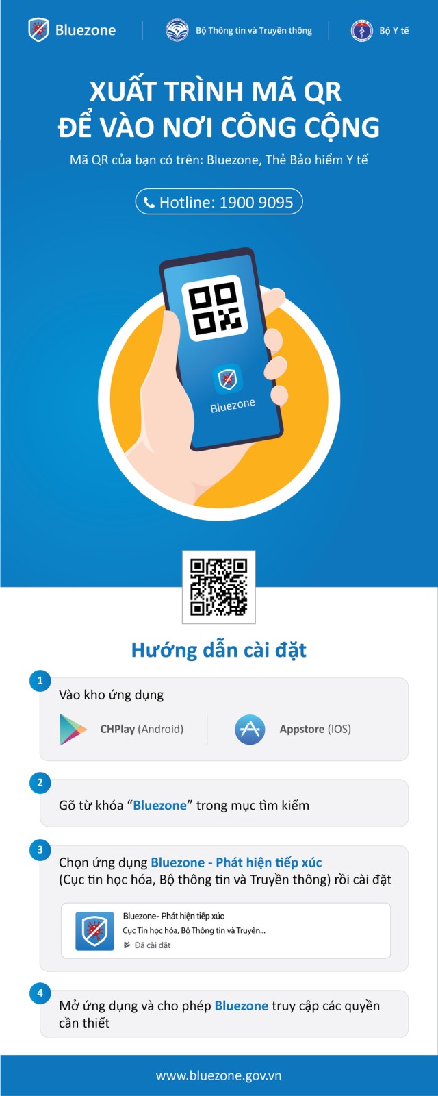 Chúng ta cùng chung tay ngăn chặn sự lây lan của virus bằng sức mạnh của cộng đồng. Bộ Y tế quyết tâm không để dịch bệnh lan rộng. Cài đặt tại www.bluezone.gov.vn hoặc www.baovecongdong.vn