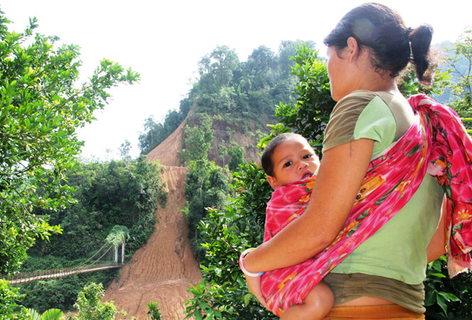 Ngược về phía tây nam của tỉnh Quảng Nam, đoàn chúng tôi phải vượt những chặng đường lầy lội, dốc núi cao dựng đứng và đi bộ hàng mấy giờ liền mới đến được các ngôi làng này (thôn 2, 3 và 4, xã Trà Vinh, huyện Nam Trà My). Ở đây chỉ có vài chục hộ sinh sống, điều kiện đi lại vô cùng khó khăn. Vì thế việc học hành của các em nhỏ rất hạn chế, nên ít được tiếp cận thông tin tuyên truyền, nhất là về pháp luật liên quan đến tảo hôn và hôn nhân cận huyết thống. Hình ảnh đầu tiên mà chúng tôi bắt gặp là những “bà mẹ nhí” thay vì đến trường như bạn bè cùng tuổi thì phải cõng con lên rẫy. Em Hồ Thị Đ là con của một gia đình ở thôn 4, xã Trà Vinh, em bỏ học khi mới đến lớp 8 và lấy chồng khi chưa đủ 15 tuổi. Khi chúng tôi hỏi em về việc lấy chồng sớm, đôi mắt đợm buồn, em khá lo lắng cho cuộc sống của mình trong tương lai, bởi em chưa có kiến thức gì trong sinh đẻ, chăm sóc con cái. Em tâm sự: “ Đang học đến lớp 8 thì bố mẹ bắt nghỉ học lấy chồng, chồng em là một người con ông chú ruột của em, do nhà chồng không có người làm nương rẫy nên phải cưới em về phụ giúp cho gia đình chồng, giờ em rất tiếc là đã không còn được đi học giống như các bạn nữa, nếu có con em sẽ không biết chăm sóc thế nào, em khuyên các bạn còn đi học thì đừng như em nữa sẽ rất khổ...”.