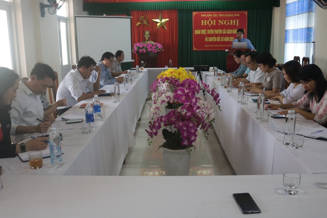 Trên tinh thần thực hiện các nội dung đề ra tại Kế hoạch số 219/KH-BDT ngày 22/4/2021 của Ban Dân tộc về tuyên truyền cải cách hành chính năm 2021 và giai đoạn 2021-2025; Kế hoạch số 454/KHBDT ngày 16/7/2021 của Ban Dân tộc về thực hiện truyền thông nâng cao nhận thức về chuyển đổi số 2021. Chiều ngày 03/11/2021, cơ quan Ban Dân tộc tỉnh Quảng Nam đã tổ chức Hội nghị quán triệt, tuyên truyền Cải cách hành chính và Chuyển đổi số năm 2021.